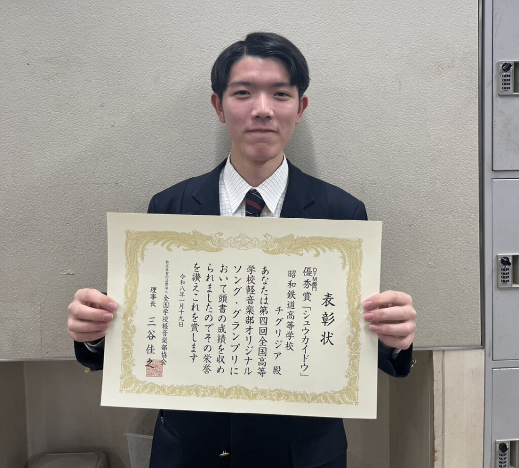 音楽部3年生の岩崎遥彦くんが、第4回全国高等学校軽音楽部オリジナルソング・グランプリにおいて、DTM部門の優秀賞を受賞しました。部員のコンテストなどでの受賞は創部以来初めてであり、受賞した岩崎くんも自身の努力が評価されたことをとても喜んでいます。今後も部員たちには自分で作曲して演奏することに果敢に挑戦してほしいです。